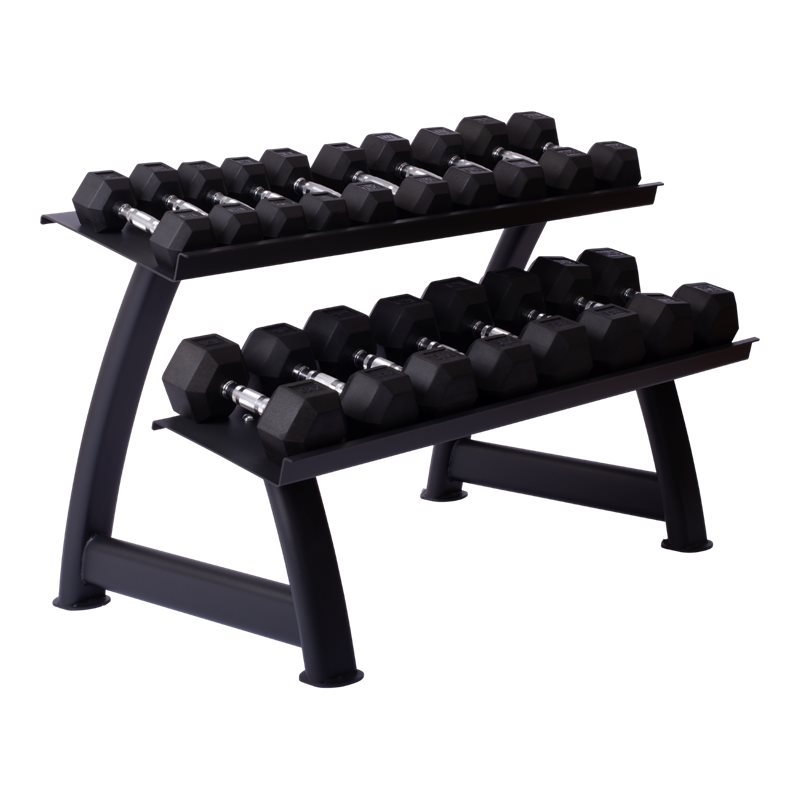 - Professionellt hantelställ Art. 68-50045B: Robust och stabilt ställ med två hyllplan för säker förvaring.
