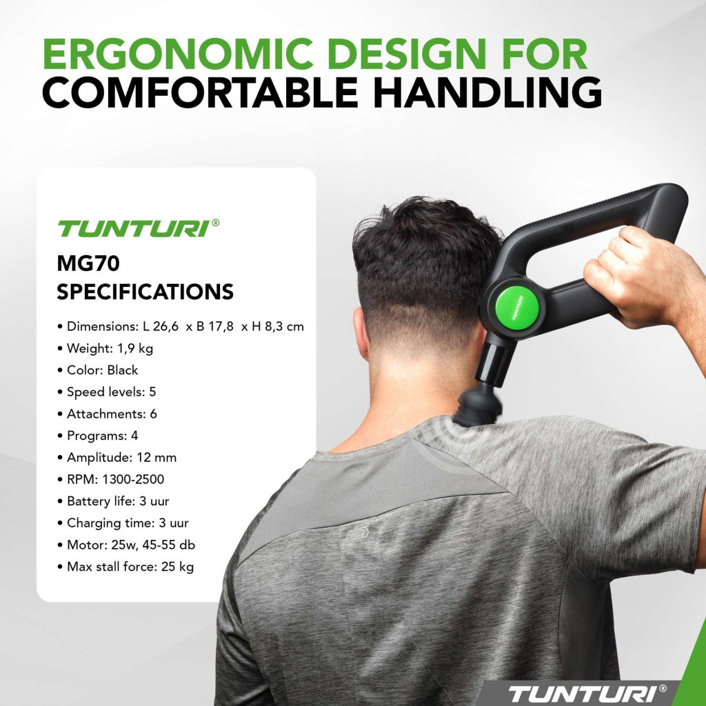 Tunturi MG70 Pro är en professionell massagepistol med 6 massagehuvuden, roterande huvud i 5 lägen, 5 hastigheter och 4 program. Med låg ljudnivå (max 55 dB), 25 kg tryckkraft och 12 mm amplitud når den djupt in i muskulaturen utan att tappa effekt.